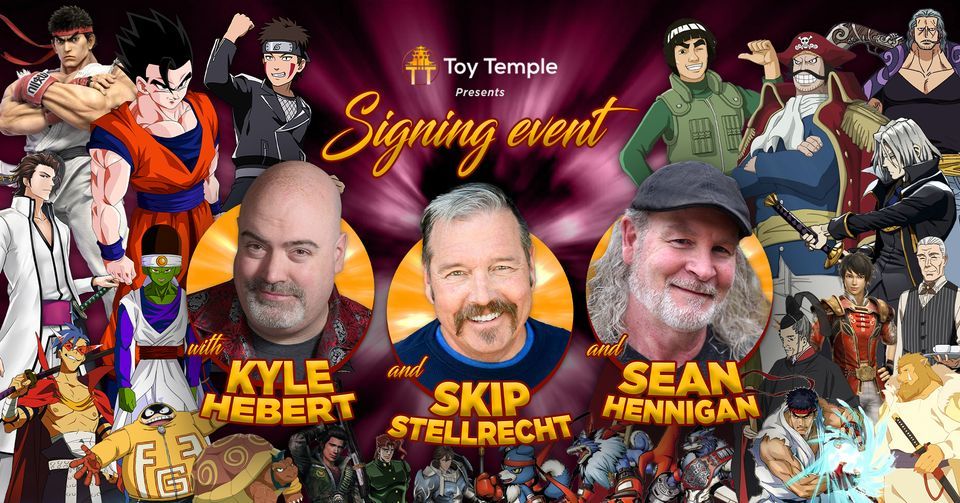 ? Toy Temple presents a special Signing Event with the Voice Actors Kyle Hebert, Skip Stellrecht & Sean Hennigan! They will be meeting fans and signing autographs at Toy Temple Headquarters on April 15th, 2023.? Kyle Hebert is an American voice actor and DJ who works for anime and video game series, such as the teenage/adult Gohan and the narrator in the Funimation dub of the Dragon Ball series, S?suke Aizen in Bleach, Ryu in the Street Fighter video game series, Kiba Inuzuka in Naruto, Kamina in Gurren Lagann, Ryuji Suguro in Blue Exorcist, Noriaki Kakyoin in JoJo's Bizarre Adventure: Stardust Crusaders, Dribble and Dr. Crygor in WarioWare Gold, and Big the Cat in Sonic the Hedgehog.