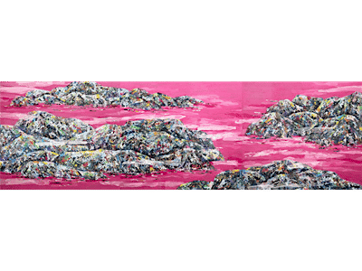 A group of larger works unfolds through mountain-like formations that gather and disperse across the picture plane. Built from layered fragments, these compositions hold a sense of terrain without fully settling into a fixed landscape. Distance and proximity coexist, and no single vantage point resolves the image.