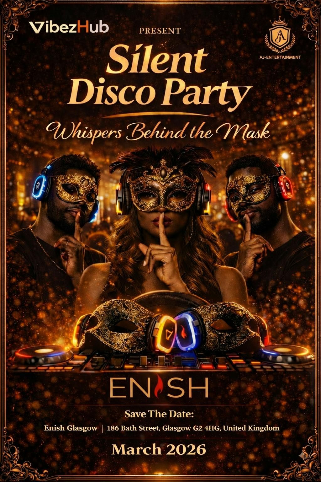 VibezHub in Collaboration with AJ entertainment brings you Whisper Behind the Mask, this is a late-night silent disco built on mystery, attraction, and feeling the moment without saying a word.You walk in masked. Faces are hidden, energy is exposed. The room is quiet, but inside your headphones the music is deep, intimate, and impossible to ignore. People move closer, eye contact lasts longer, and connections happen naturally—no small talk, no pressure.