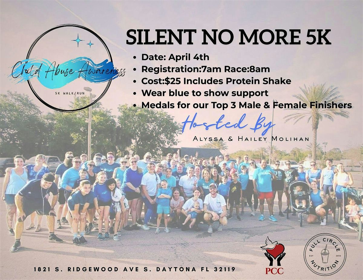Join us for our 2nd Annual Silent No More 5K, a child abuse awareness walk/run created to give a voice to survivors and tangible support to those healing. Hosted by a mother–daughter duo, Alyssa & Hailey Molihan, this event was born from a shared mission: to turn awareness into action and pain into purpose.All proceeds directly benefit PCC of Daytona, supporting children currently in or seeking therapy due to child abuse, as well as adults bravely taking the first steps toward healing. Thanks to the success of our first event, a dedicated fund has been established—allowing PCC to draw from it to provide ongoing therapy services to individuals in our community who need it most.By showing up, wearing blue, and taking each step together, we stand for protection, healing, and hope. We remind survivors they are not alone—and that their stories matter.