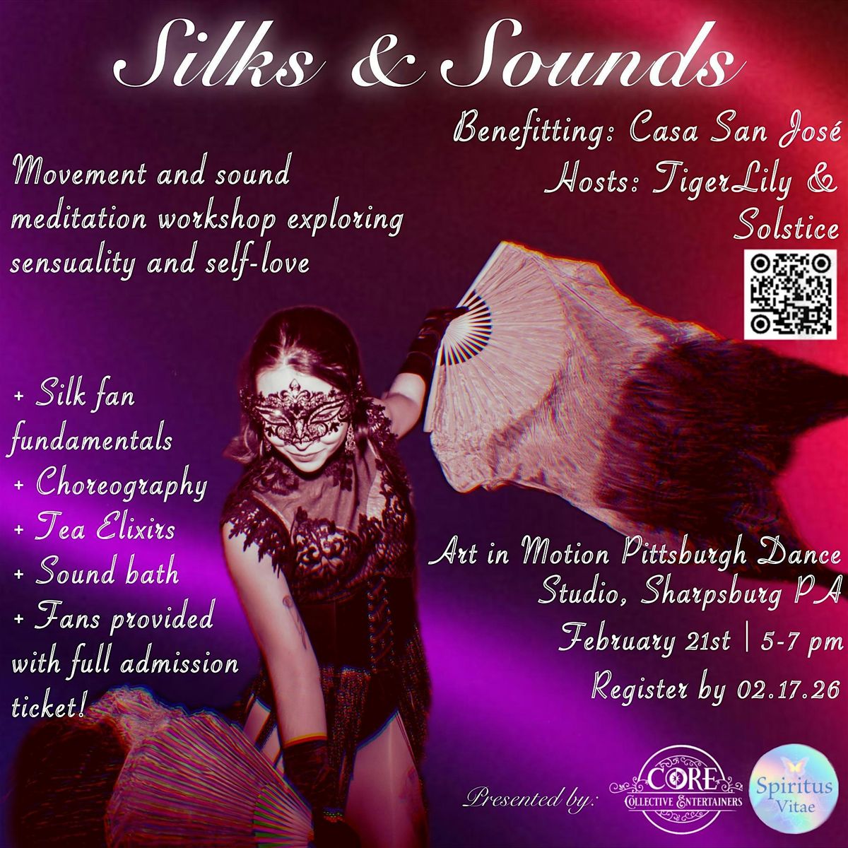 Core Collective Entertainers Presents: Silks & Sounds, a beginner-friendly silk fan workshop benefitting Casa San Jose, a local nonprofit that connects, supports, and advocates with the Latino community of Pittsburgh through vital services such as food assistance, educational programs, and immigrant rights advocacy. We will explore concepts of self-love and sensuality through a guided movement and sound meditation with silk fans and singing bowls.