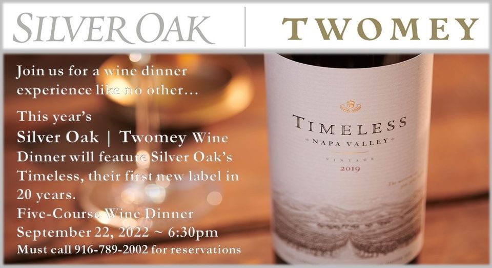 This year's Silver Oak/Twomey Wine Dinner soars above the rest with the addition of the Silver Oak Timeless. Timeless is the first new Silver Oak label in 20 years - "a wine of singular beauty that paints a grander, classic portrait of Napa Valley." You will enjoy five delicious courses expertly prepared by Chef Derrick and his amazing team, and paired perfectly with these stellar wines. Our wine dinners sell out every month, so don't wait. Menu here: https://laprovenceroseville.com/silver-oak-twomey-wine-dinner/ $175 per person. Reservations require a credit card and must be made by phone only 916-789-2002 - 21 & over only.