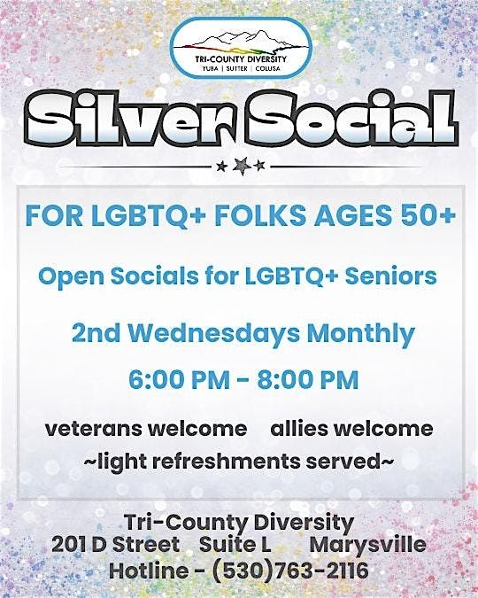 Join us for the TCD Silver Social by and for LGBTQIA+ seniors ages 50 and up every 2nd Wednesady of the month from 6-8pm. Come and connect with like-minded individuals in a relaxed and friendly atmosphere. Enjoy a variety of social activities, including peer support, sharing resources, board and card games, music and more with light refreshments. Veterans and allies welcome. This is the perfect chance to socialize, create connections, and have fun with other LGBTQIA+ seniors in the community.