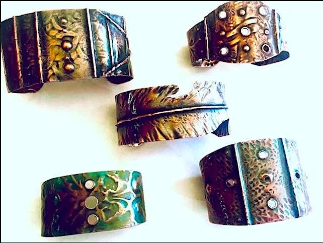 This cuff is rugged and dramatic and incorporates a variety of texturing, forming and patina techniques. You’ll leave with one (possibly 2 depending on complexity) one-of-a-kind cuffs of your own design. In class we’ll work in copper. If you’d like to also work in sterling silver, please purchase a piece sterling silver sheet, dead soft temper, at least 7 inches by 2 inches in 22 gauge and bring with you to class.