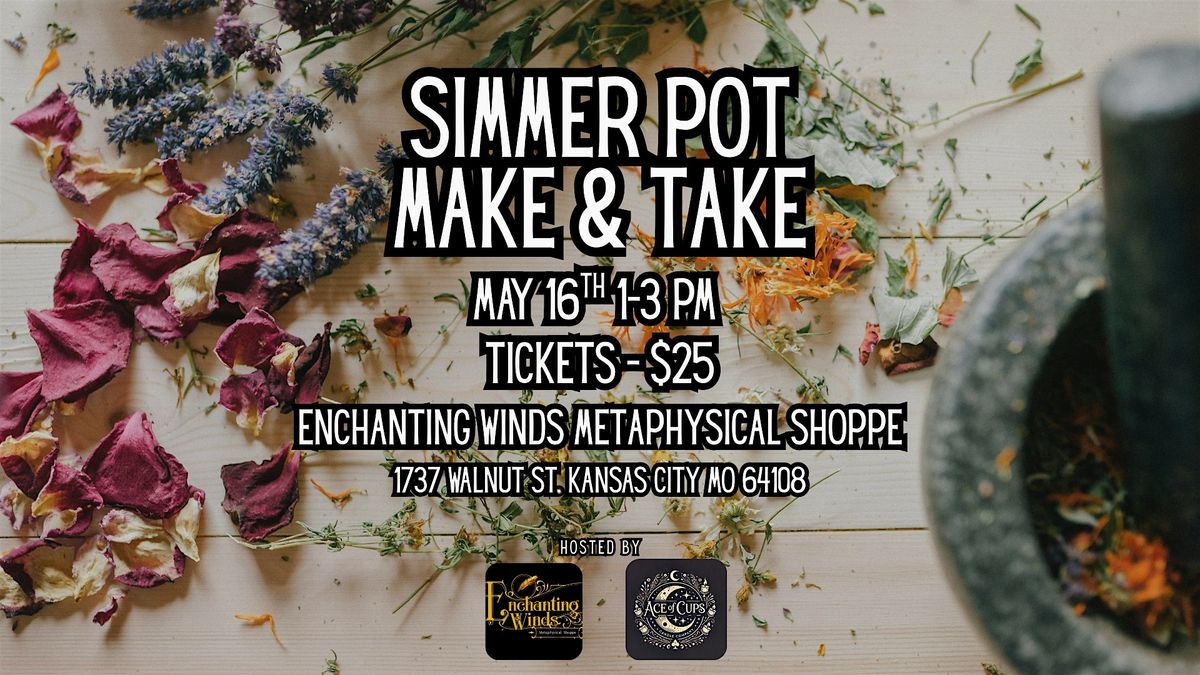 Join us at Enchanting Winds Metaphysical Shoppe for a fun and relaxed Simmer Pot Make & Take session! On May 16, 2026 at 1:00 PM (Central Time), you'll get to create 2 fragrant simmer pot to take home and enjoy. Perfect for adding cozy vibes to your space, creating a metaphysical spell for your whole home, or gifting to someone special. No stress, just good times and great scents. You can pop in any time from 1-3 PM as creating your Simmer Pot Mixes is a quick activity that won't take time away from your busy Saturday!