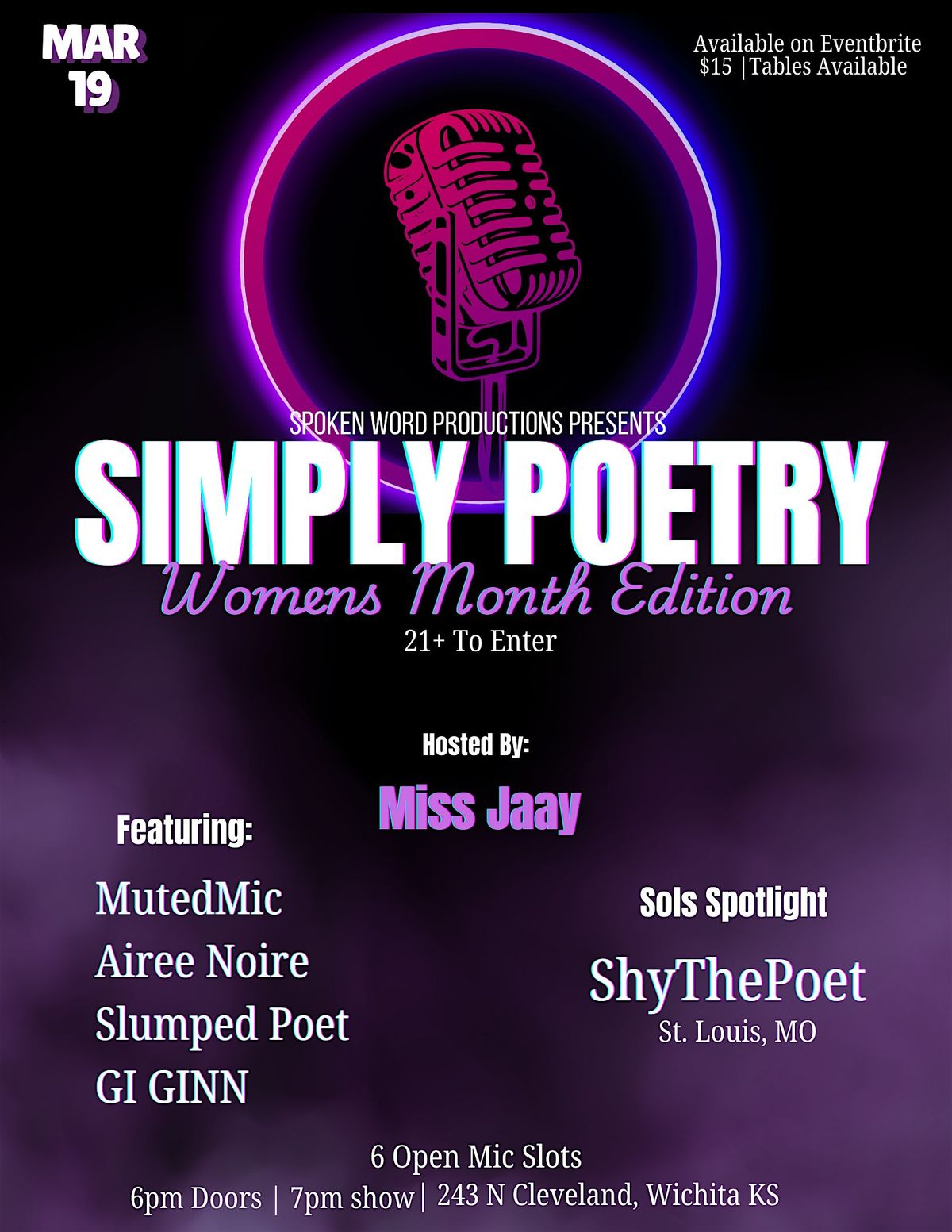 Get ready for a night full of words and vibes at Simply Poetry featuring the amazing ShythePoet! If you’re in Wichita, KS, come through for some authentic, heartfelt performances. This one’s in person, so bring your energy and love for poetry. Whether you’re a fan or just curious, it’s gonna be a chill, inspiring evening you won’t wanna miss!