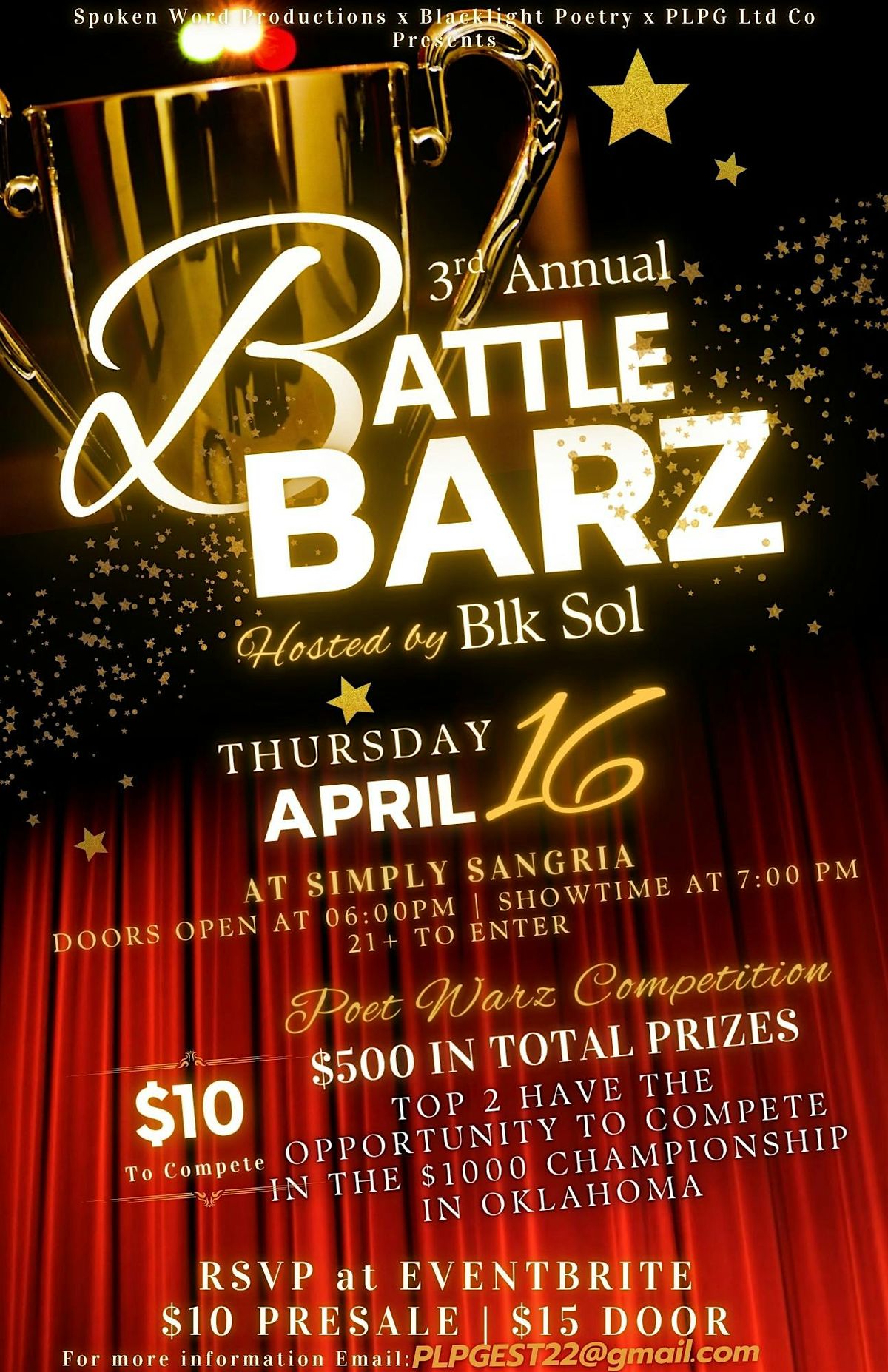 The 3rd Annual Battle Barz is an individual poetry slam bringing together some of the strongest voices from across the Heartland for a night of words, wit, and high-stakes performance. Hosted through the continued partnership of Spoken Word Productions, Blacklight Poetry, and PLPG Ltd Co, this event centers poetry as both art and competition.