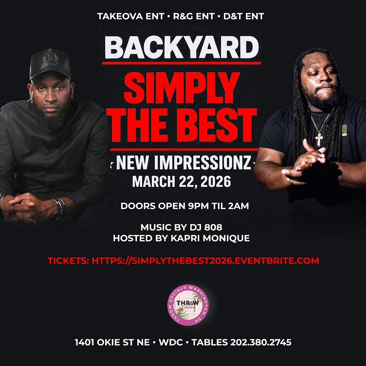 BACKYARD and New Impressionz at Throw Social. You don't want to miss this event at DC's premiere Event Space, Throw Social. Spacious Cabanas available and outdoor patio open.