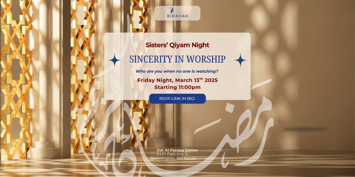 Join us for a night of spirituality and sisterhood as we reflect on sincerity in worship through private acts of devotion, the beauty of Tahajjud, inspiring stories of the Salaf and their hidden worship, building a personal relationship with Allah, and prophetic duʿās in the Qur’an that demonstrate true reliance upon Him.