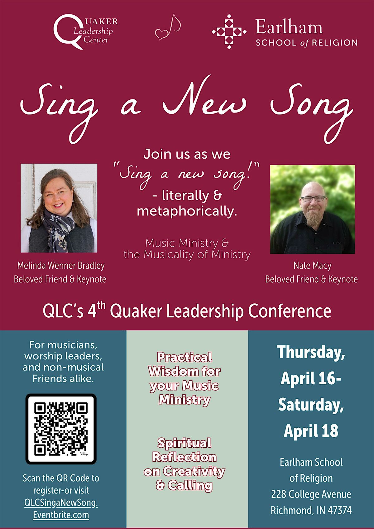 Join us as we come together to discern how we are being called to follow the biblical & spiritual imperative to "sing a new song" - whether literally or metaphorically. Through keynotes, workshops, worship, singing, and small groups we will listen for the songs rising in our hearts and from the divine heart. We will consider practical wisdom for music ministry as well as spiritual wisdom about the "musicality of ministry." Whether you are a musician, worship leader, or non-musical Friend, you will benefit from our time together.
