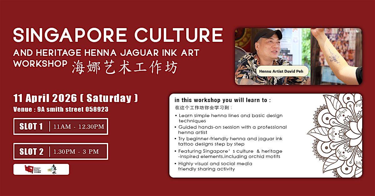 Inspired by Singapore’s culture and heritage, the session will also introduce unique design elements such as orchid motifs. Whether you are new to henna or simply looking for a fun and creative activity, this workshop offers a relaxing and highly visual experience perfect for friends, families and social sharing.