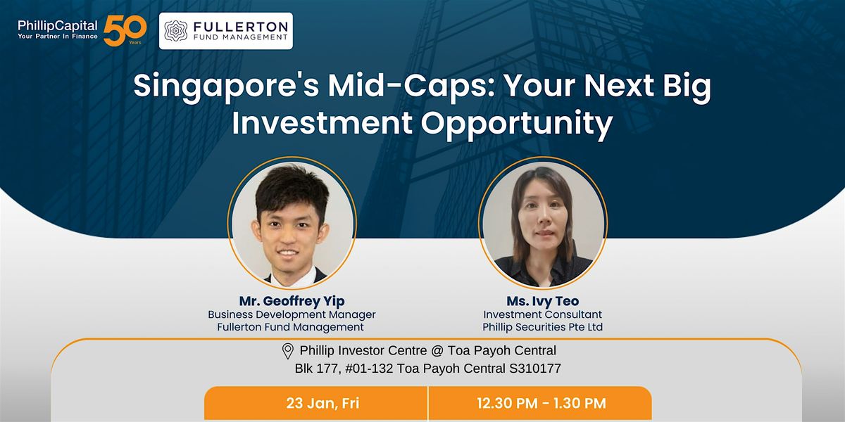 Join us at this seminar on 23 Jan, Fri at 12.30pm, where Mr Geoffrey Yip, Business Development Manager at Fullerton Fund Management and Ms Ivy Teo, Investment Consultant at Phillip Securities will explore key sectors driving Singapore’s mid-cap market, current trends, and how mid-caps can diversify your portfolio while enhancing returns.