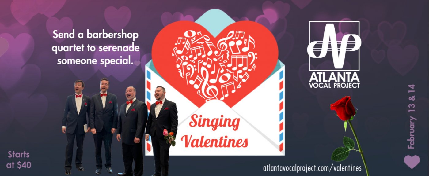 Our popular live quartet serenade program is back! For a truly memorable Valentine's experience, we will send out a talented barbershop quartet on Valentines Day to serenade a loved one (in Atlanta and select surrounding suburbs) with two classic love songs, while hand-delivering a rose and personalized card, all starting at $40. Or we'll even sing over the phone or video chat to anywhere in the world for just $25! Have a special request in mind, like singing in a restaurant or for an assisted living home? Contact us and we'll try to make it work. We're flexible!