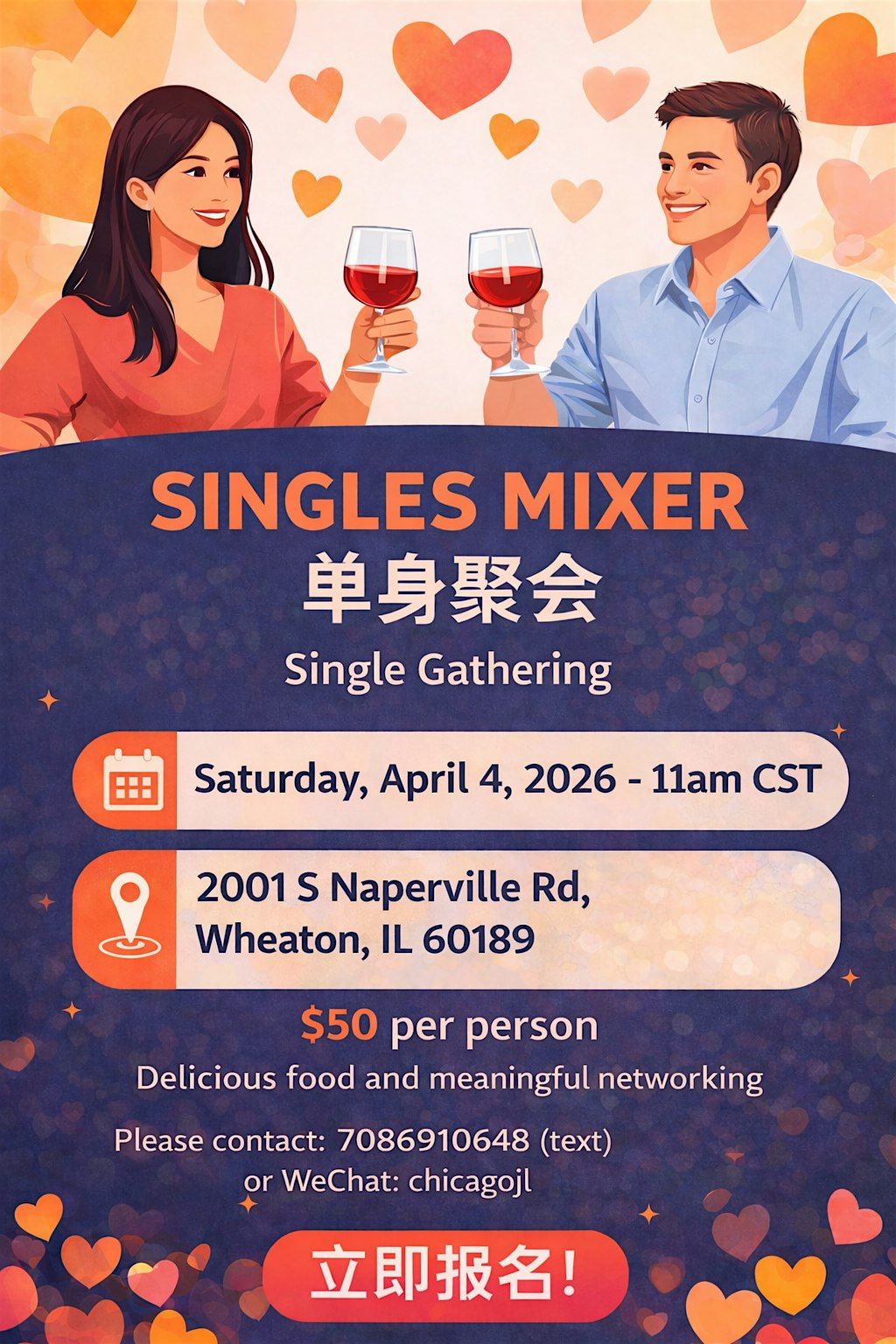 Join us for a fun and casual Single Mixer at 2001 S Naperville Rd (LU'S FINE ASIAN CUISINE)! It's the perfect chance to meet new people and enjoy some great food together. We'll be gathering on April 4, 2026 at 11:00 AM (Central Time). Don’t miss out on this laid-back event where making connections is the main goal or your better half. See you there! $50 per person, please zelle to [email protected]