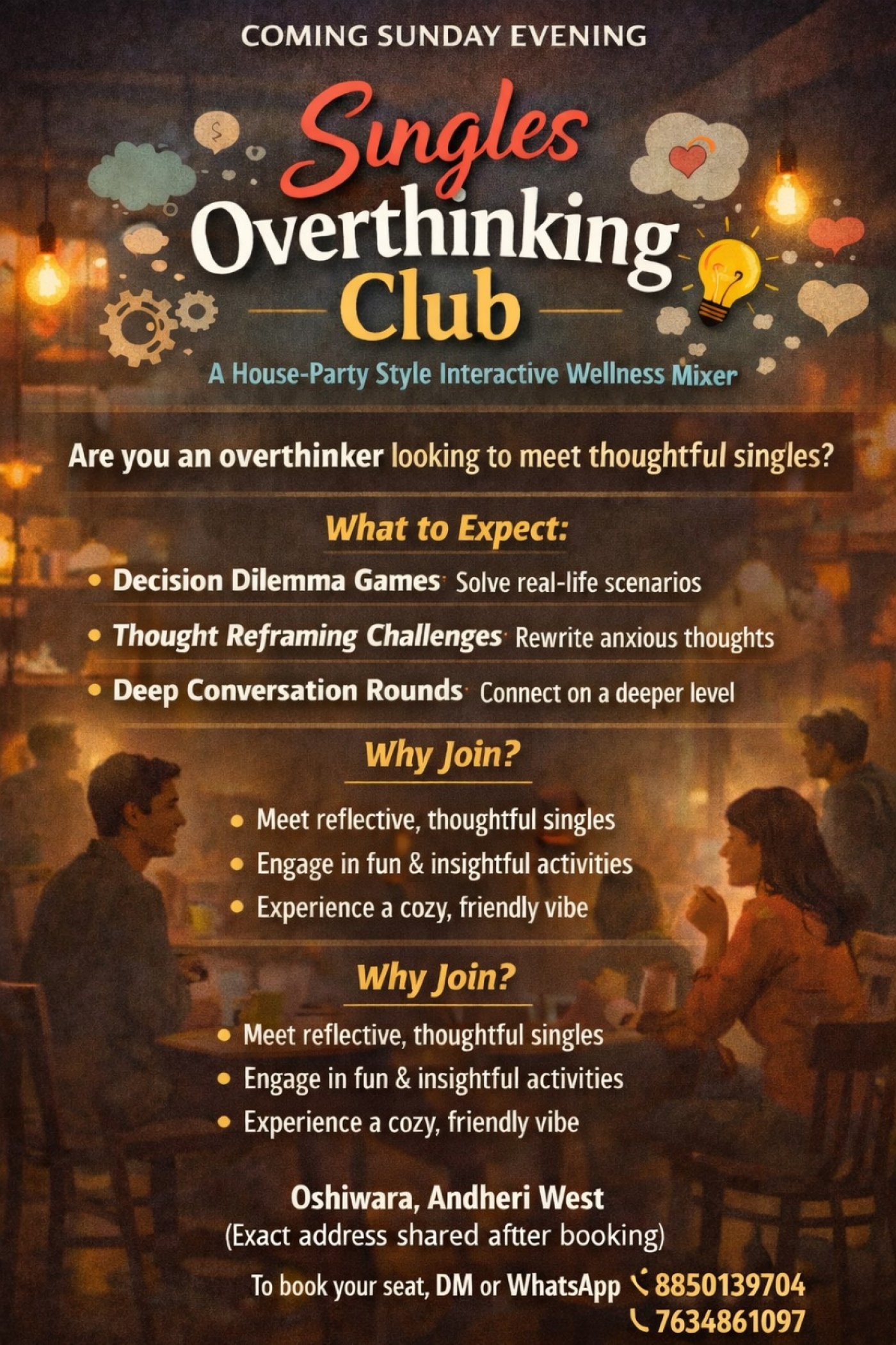 The Singles Overthinking Club is a guided social evening where strangers connect through psychology-based games, reflective discussions, and shared dilemmas — so conversations happen naturally without awkwardness.