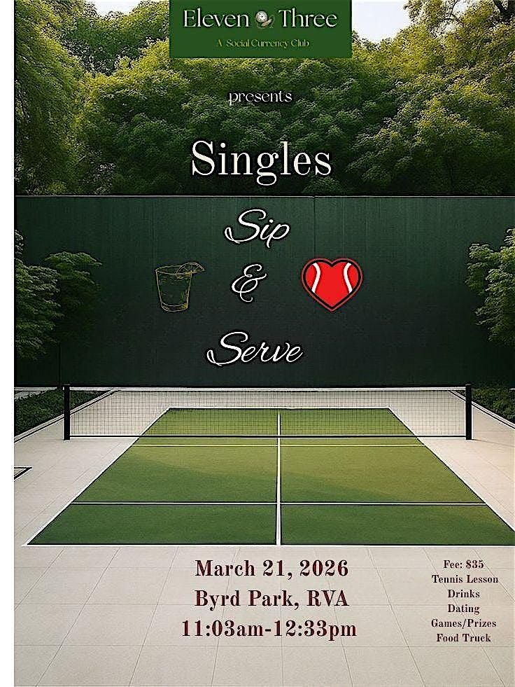 You're invited to a fun morning of tennis and mingling at Byrd Park on March 21st 11:03am. Join us for a charming singles mixer where the courts are set for connection and the atmosphere is as opulent as your game.