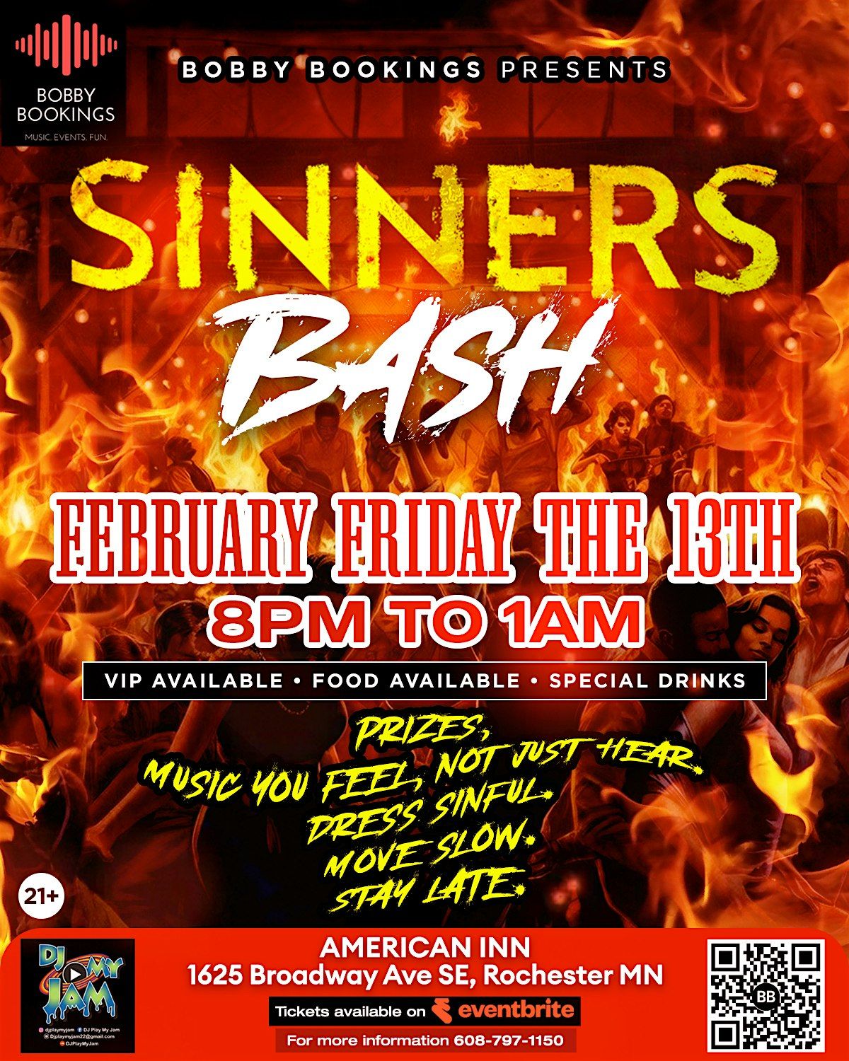 Sinners Bash: a grown & intimate R&B and neo-soul night—juke-joint soul, slow jams, and dark Friday the 13th vibes.