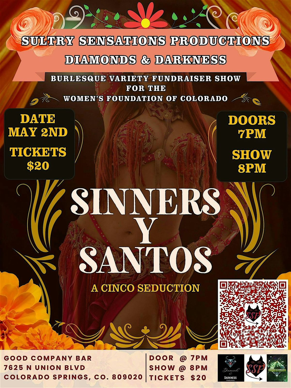 Sultry Sensations Productions with Diamonds and Darkness Presents Sinner Y Santos, a Burlesque Variery Fundraiser benefitting the Women's Foundation of Colorado. Come be mesmerized and entertained with a Cinco De Mayo Celebration honoring Mexican Heritage and long-standing traditions with plenty of sexy, fabulous flare.
