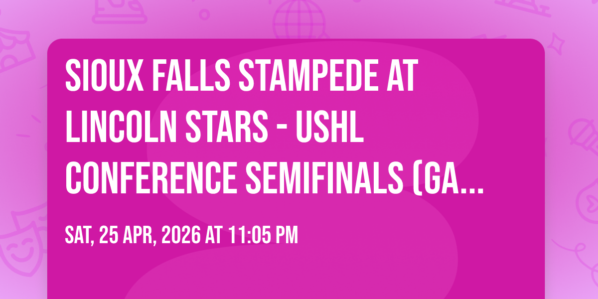 📍 Location: 40.8329, -96.6972🎉 Welcome to Sioux Falls Stampede at Lincoln Stars - USHL Conference Semifinals (Game 4, Home Game 2), where dreams come alive and possibilities are endless! 🏛️ Join us at The Ice Box in the heart of Lincoln, NE for an event that defies expectations. 📅 On April 25th, 2026 at 11:05 PM, be part of something truly extraordinary as we bring together innovation, entertainment, and pure magic. ✨ Every aspect has been carefully designed to ensure an unforgettable experience for all our guests. Whether you're seeking adventure, inspiration, or simply a break from the ordinary, this event promises to deliver beyond your wildest dreams. 🎊 Prepare for a journey into the extraordinary!