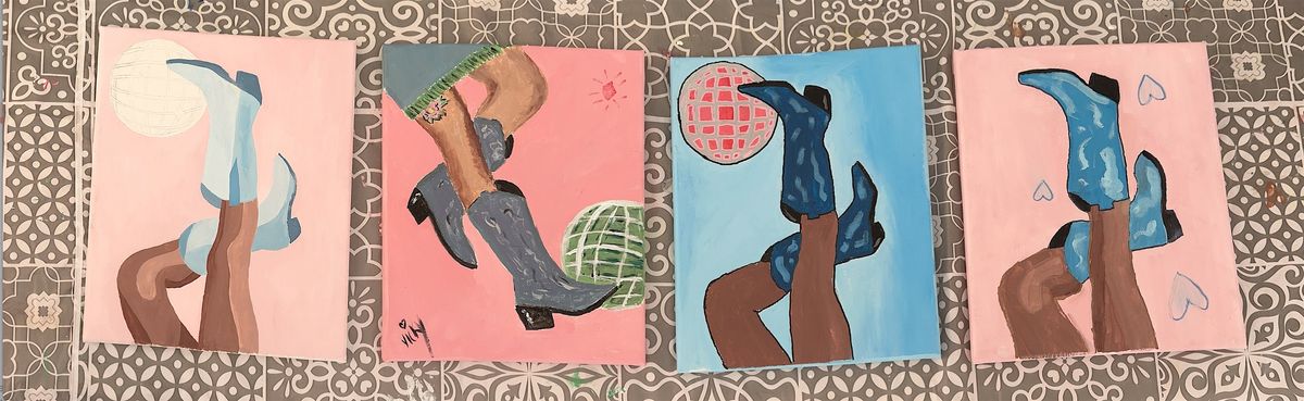 To help get your creativity sparkling, your first drink is included. You can look forward to a relaxed, friendly atmosphere brimming with great music and plenty of laughs as you learn the techniques.You'll also learn how to add personal touches to your painting, perhaps your initials, a favourite phrase, or colours that truly reflect your unique cowgirl style. The theme is all about bold cowgirl meets disco glam, think boots, sparkle, and attitude!Feel free to embrace the theme with cowboy boots and western flair, though this is completely optional. Come dressed up or comfy, whatever suits your style!This class is a brilliant option for a girls’ night out, birthday celebrations, a unique date night, or simply if you're looking for a wonderfully different and fun activity. You'll leave this inspiring experience with not only your fabulous, personalised cowgirl artwork to take home but also a delightful sense of creative accomplishment.