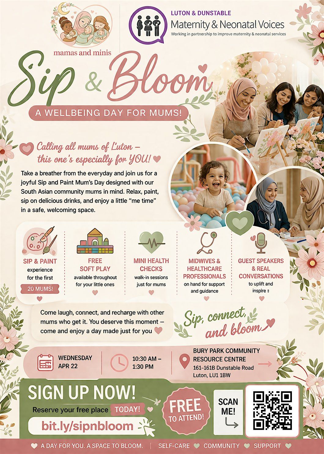 Take a breather from the everyday and join us for Sip & Bloom, a joyful wellbeing day designed with our South Asian community mums in mind. Relax, paint, sip on delicious refreshments, and enjoy a little “me time” in a safe, welcoming space.