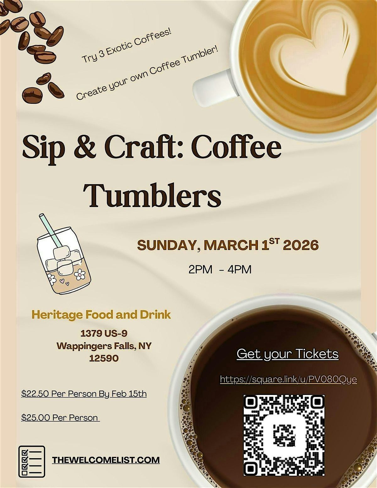 Join us for a cozy coffee experience where we taste 3 exotic coffees, craft your own tumbler, and meet other coffee enthusiasts.
