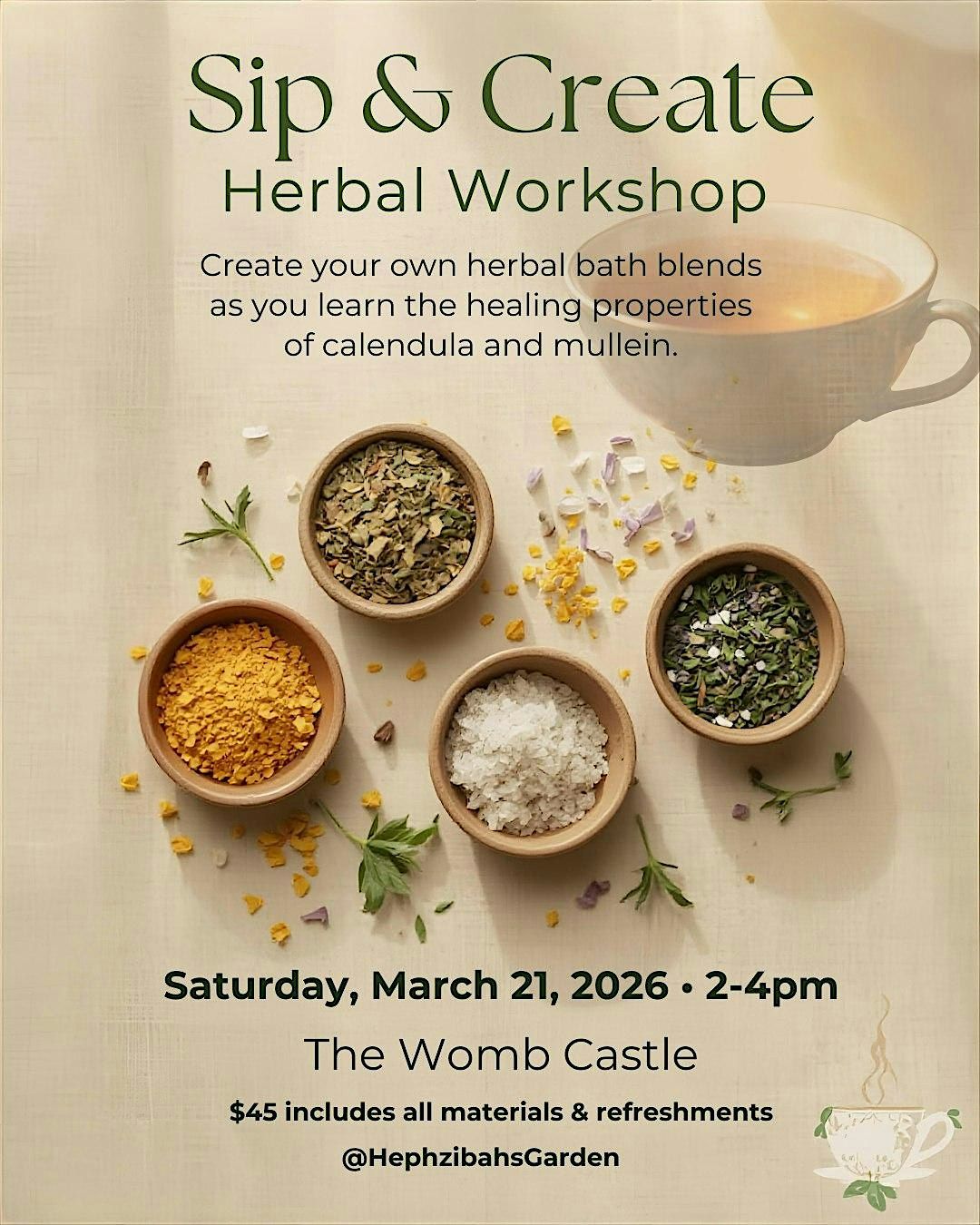 You're invited to the Womb Castle for a relaxing and educational workshop designed to blend creativity with wellness. Unwind, sip, and explore the art of herbal crafting in this hands-on workshop. Enjoy a soothing beverage while learning about the healing properties of herbs and crafting your own personalized herbal bath blend.