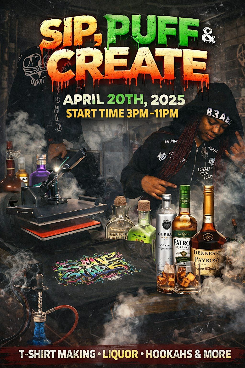This is a Sip/Puff & Create where you can create your own merch. This event will be broken up into 3 different sessions 1st session will start at 3:15pm and will end at 5:15pm the second session will start at 6:15pm and will end at 8:15pm and the last session being the longest it will start at 8:30pm and will end at 11:30pm A VARSITY JACKET, JOGGING SUIT, PULLOVER HOODIE, ZIP-UP HOODIE, BEANIE, CREWNECK, AND SHIRT CAN ALL BE MADE BY YOU. There will be a variety of DTF transfers to choose from in all color and sizes and if you do not see a DTF transfer you like you can customize your own design. there is 5 packages to choose from. THIS IS A 4/20 FRIENDLY BYOW EVENT ON 4/20. This is an 18+ event with a 360 photo booth, an edible bar with items like koolaid, chips, rich krispies, cakes, and more, and complimentary food and drinks.