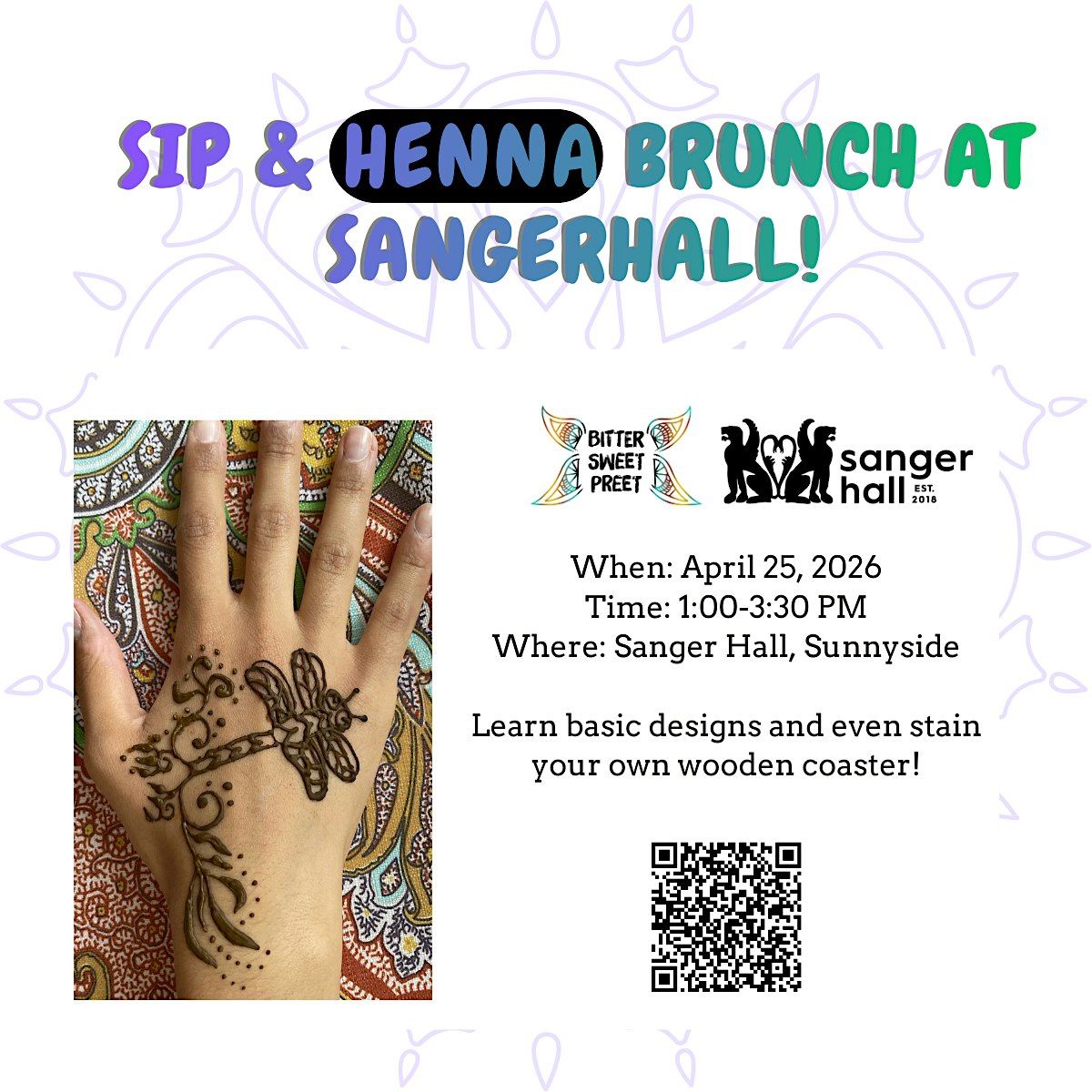 Come join BitterSweetPreet (Jaspreet Bains) at Sanger Hall for a Sip and Henna Brunch where you can learn the art of henna! This is meant to be a fun crafting class, so no experience is necessary. As a bonus, we will be staining wooden coasters with your unique henna design to take home with you!