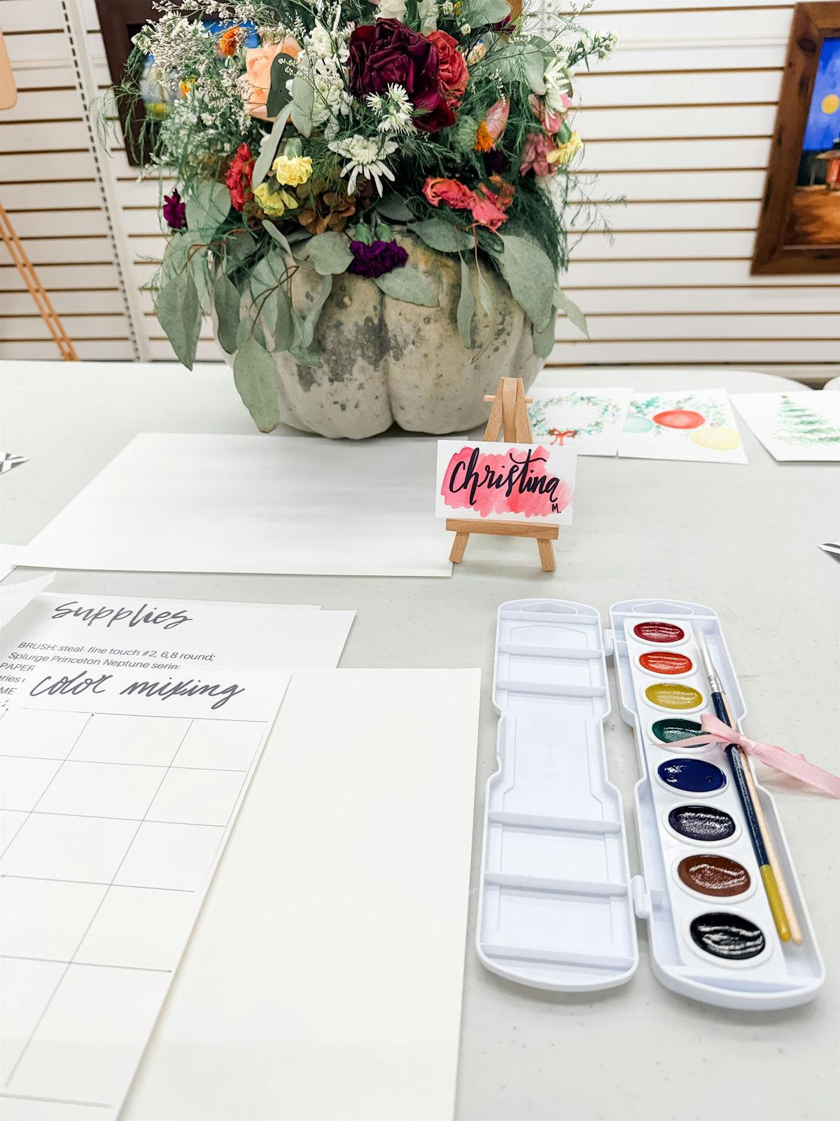 Join us for a relaxed beginner watercolor workshop where we’ll explore the foundations of painting with watercolor in a soft, creative setting. Together we’ll cover the basics of color theory, practice essential brush strokes, and learn how to build a balanced floral wreath composition. With step-by-step guidance, you’ll create your own delicate floral wreath painting while gaining confidence with watercolor techniques. No experience is required—just come ready to slow down, create, and enjoy the process.