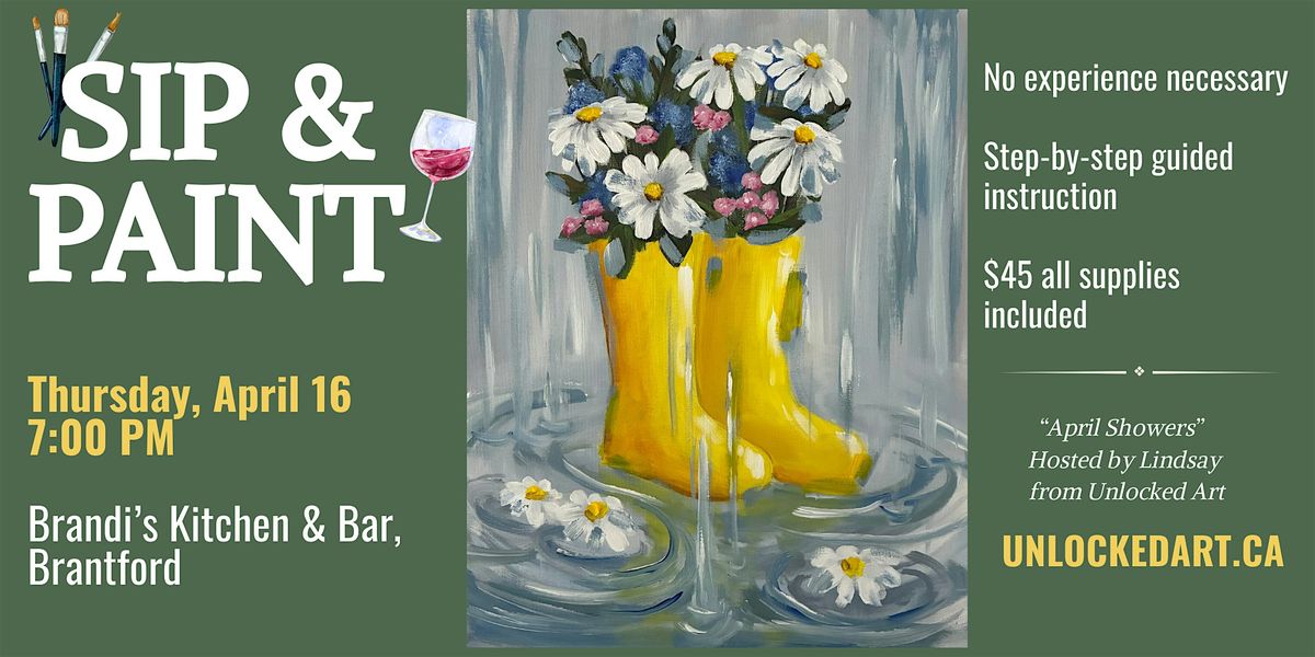 Welcome spring with a creative night out as we paint “April Showers”, a cheerful scene featuring bright yellow rain boots overflowing with fresh blooms on a rainy day.