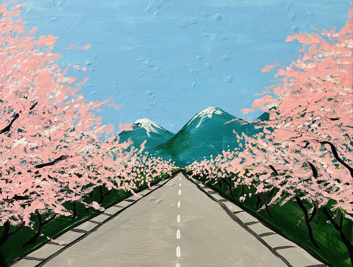 An acrylic painting of cherry blossoms in full bloom, set against serene mountains that fade into the background.