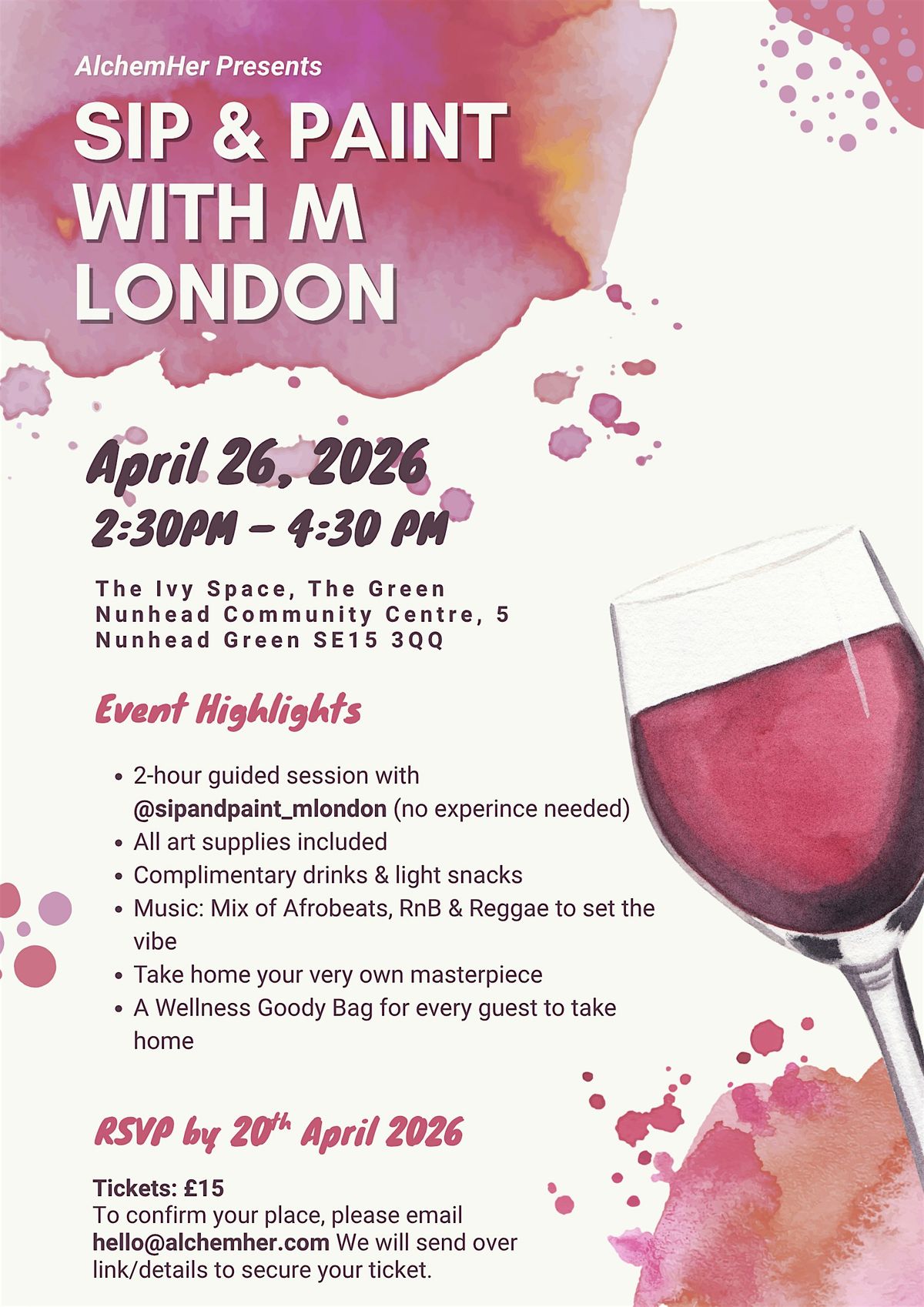 Hosted by the vibrant Melissa Hurst (@sipandpaint_mlondon), you will be guided through a 3-hour painting session set to an uplifting soundtrack of Afrobeats, R&B, and Reggae.