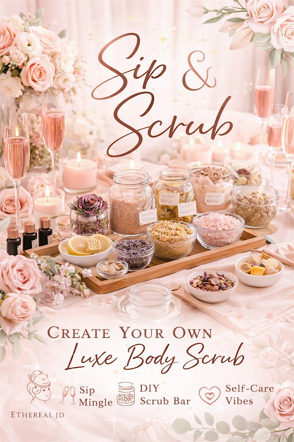 You’ll create your own custom body scrub, enjoy drinks, light bites, and an intentional atmosphere focused on softness, self-care, and connection.