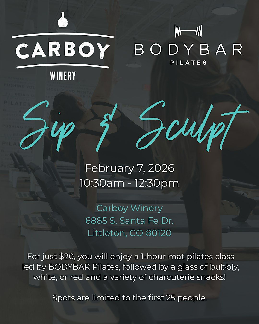 Welcome to Sip & Sculpt at Carboy Winery Littleton! Join us on February 7, 2026 at 10:30 AM for a fun-filled morning of movement with BODYBAR Pilates followed by some delicious sips at the winery.