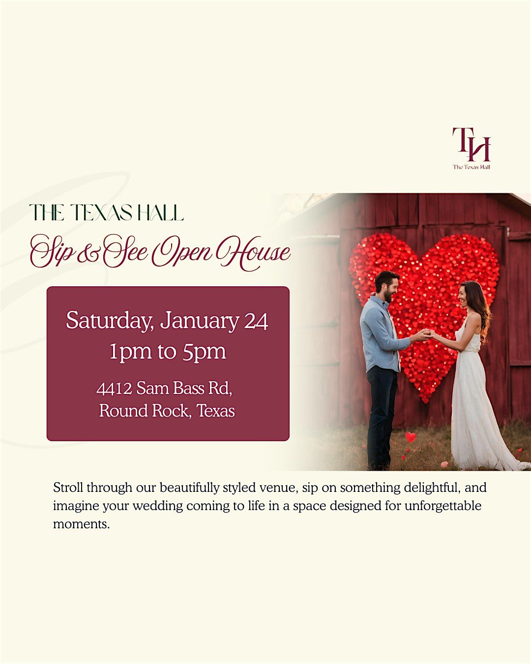 Join us for an exciting in-person event. Explore our venue, meet our team, and discover all the amazing possibilities for your next gathering. Whether you're planning a wedding, corporate event, or special celebration, Texas Hall has everything you need to make it unforgettable. Don't miss this opportunity to see our space in person and envision your event coming to life.