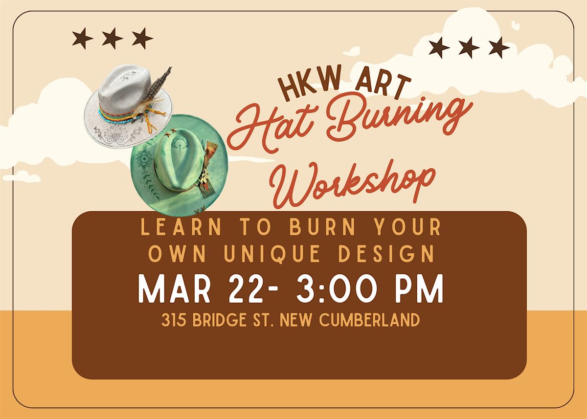 Grab a friend and get ready to unleash your creativity in a fun, hands-on craft session - no skills needed! Pick your hat (size medium fits 56-58cm head circumference. If you need larger (58-60cm), please let us know prior to the event. Free-hand or trace your design, burn it, add accessories, and Rock it! Cost includes hat, 2 hat band accessories, and instruction. Snacks and water provided, BOYB