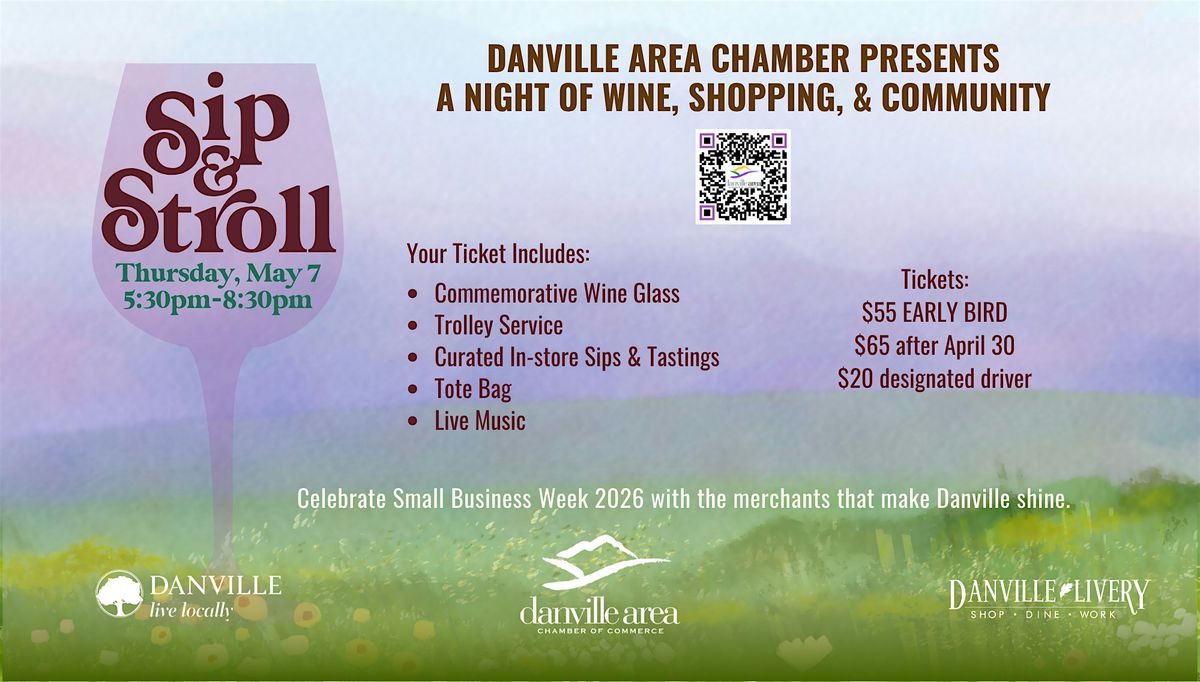 We’re excited to invite you to join us for the Sip & Stroll, Thursday, May 7th 2026 📅, 5:30 PM – 8:30 PM in Downtown Danville and the Danville Livery. Our Wine Strolls have been signature events for the Danville Area Chamber of Commerce for the last 20 years.