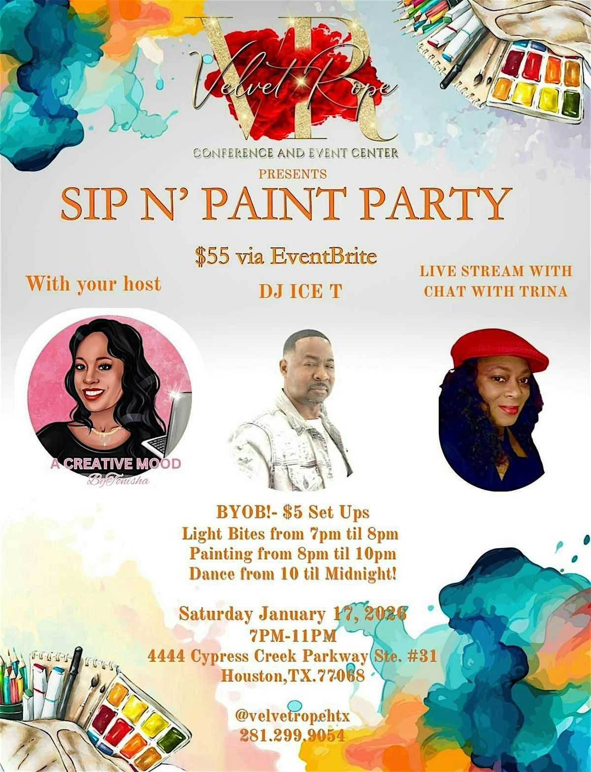 Join us for a super fun in-person Sip n’ Paint Party! Bring your friends grab a drink, a bite, and unleash your inner artist! No experience needed—just good vibes and creativity. We’ll supply the paint, canvases, and plenty of inspiration. It's the perfect way to unwind, chat, and create something awesome together. Can’t wait to see you there for an evening full of laughter, color, dancing and good times!