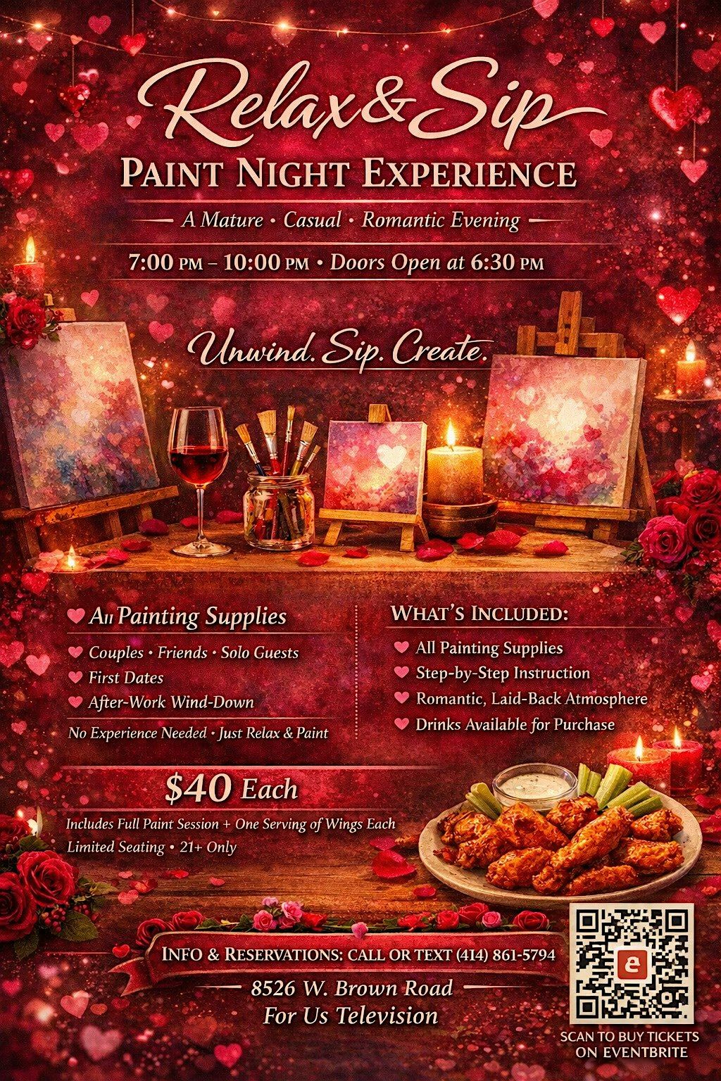 Mature Paint & Sip experience. Guided painting, chill vibes, wings included, drinks available. Limited tickets. No drama.