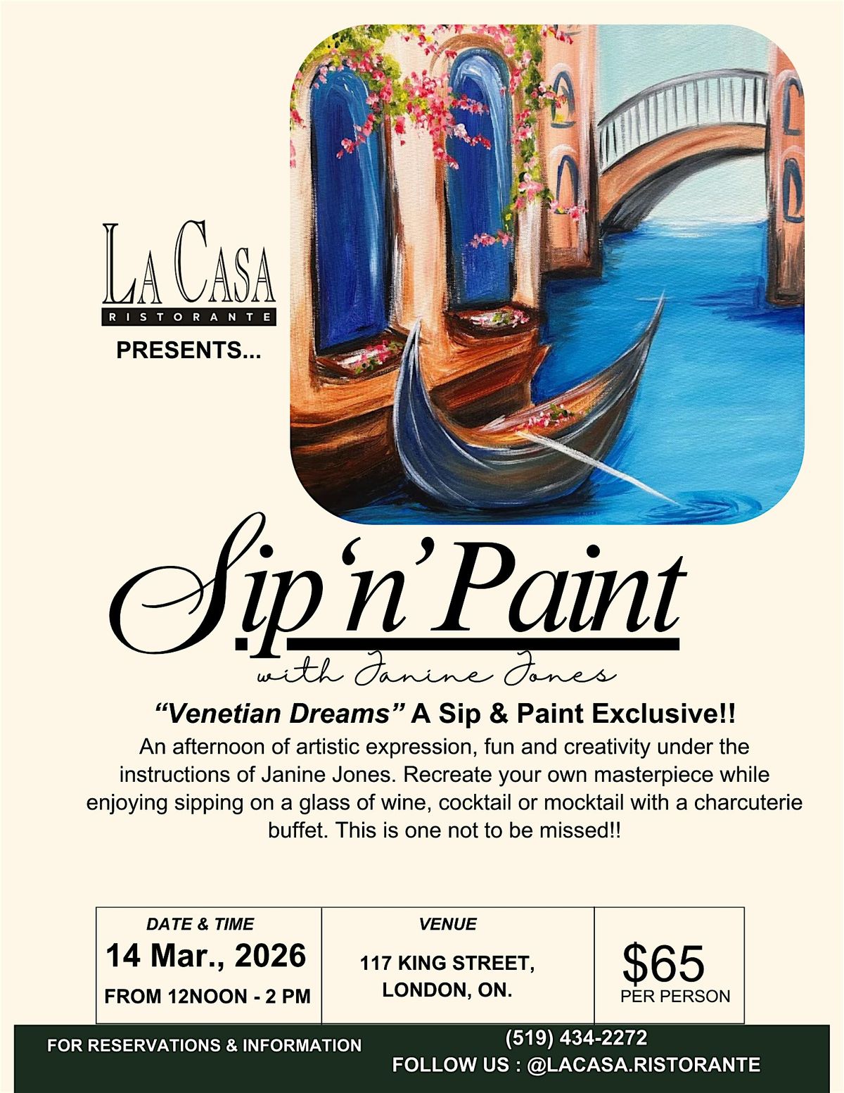 Join us at La Casa Ristorante for an unforgettable afternoon of creativity, cocktails, and Italian charm at our Sip ’n’ Paint: Venetian Dreams 🛶💙