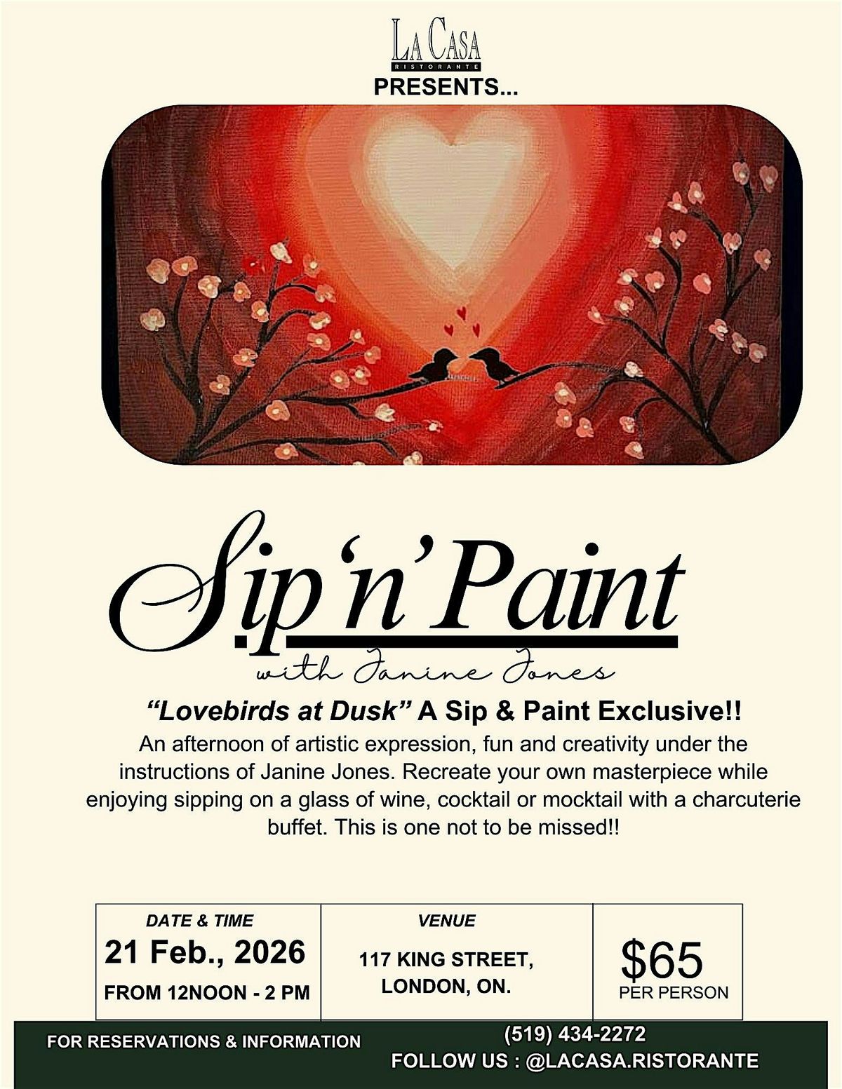 La Casa Ristorante presents “Lovebirds at Dusk” — a Sip ’n’ Paint Exclusive with Janine Jones.