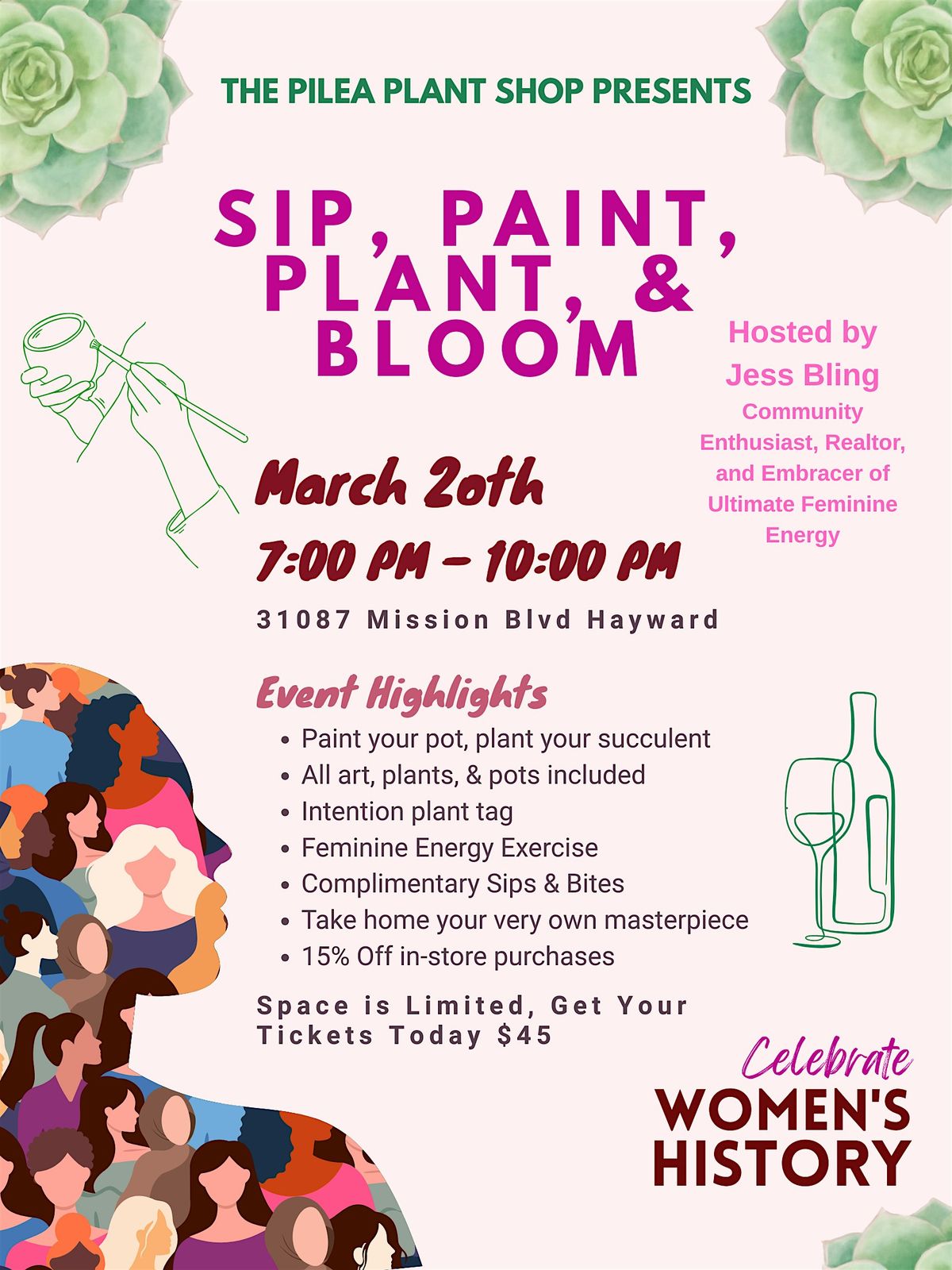 🌸🌿 Sip, Paint & Bloom — International Women’s Month Celebration 🌿🌸 📅 March 20th 🕖 7:00 PM – 10:00 PM 📍 The Pilea Plant Shop 31087 Mission Blvd Hayward, CA 94544 Join us for Sip, Paint & Bloom, a special International Women’s Month experience Through sipping, painting, and planting, we’ll reflect on identity, resilience, and the beauty of womanhood in a space designed to uplift and empower. ✨ Your Ticket Includes: • Pot • Plant • Paint • All creative supplies • Guided feminine energy exercise • “Bloom with Intention” reflection moment • Complimentary sips • Light bites This is more than a workshop — it’s an intentional evening of creativity, connection, and celebration. Come solo or bring your girlfriends and bloom together. 🌸