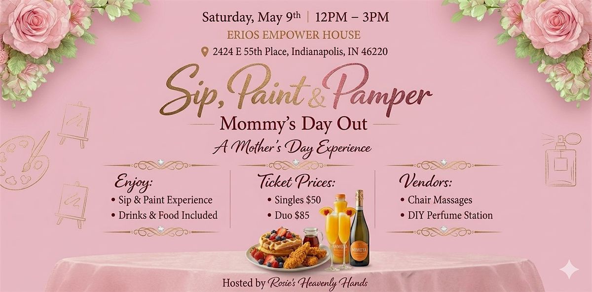 Join Rosie’s Heavenly Hands for an afternoon of "Soft Life" luxury at Sip, Paint & Pamper: Mommy’s Day Out. We’ve curated the perfect atmosphere for you to unwind, create, and vibe out with good music and even better company.