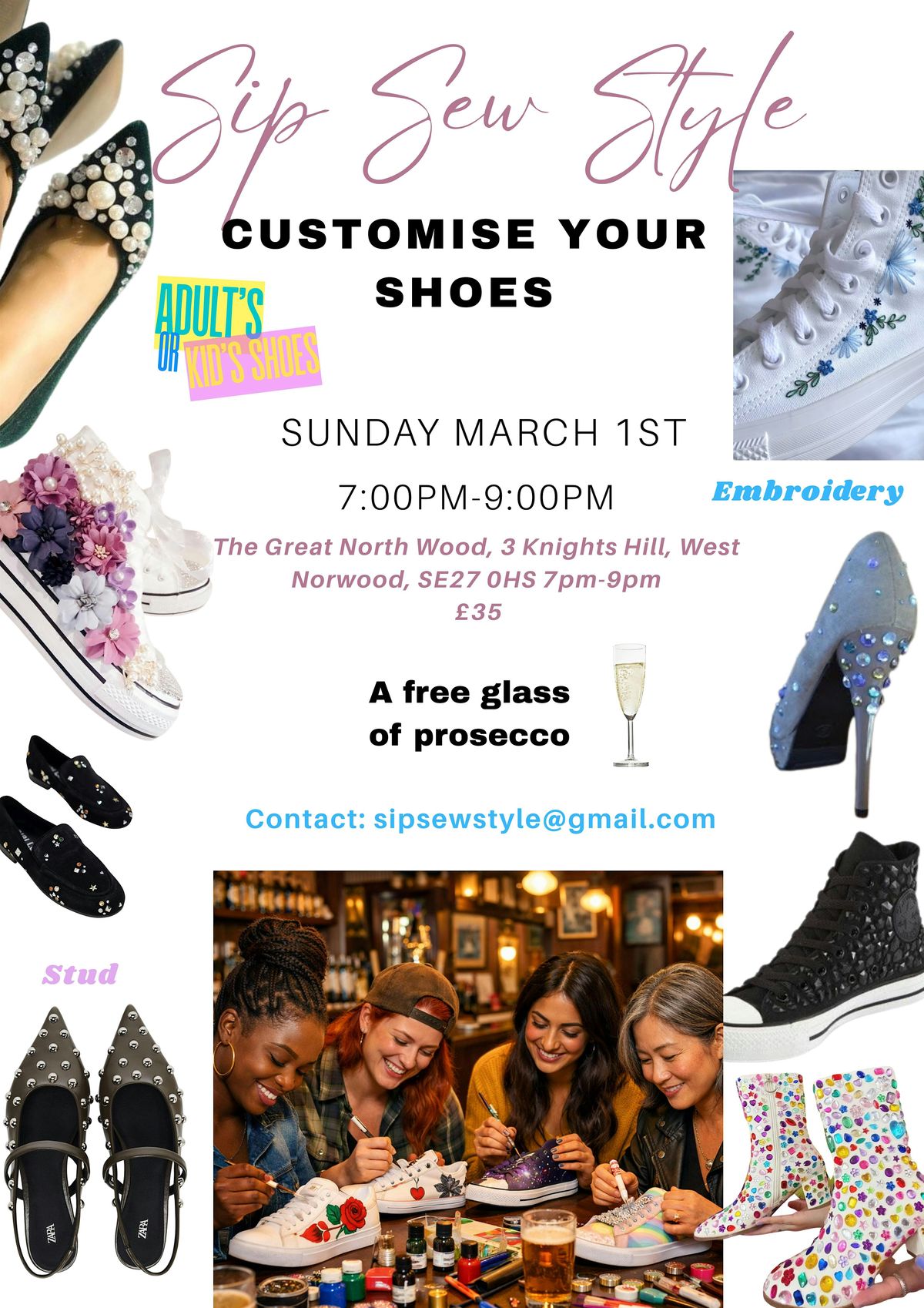 Sip Sew & Style is a customising class for adults. Come and make what you already own feel new. For this class we will be transforming your shoes or trainers, through adding embellishments like rhinestones, studs or embroiderry. Join us for a creative night out and enjoy a free glass of prosecco whilst doing it.
