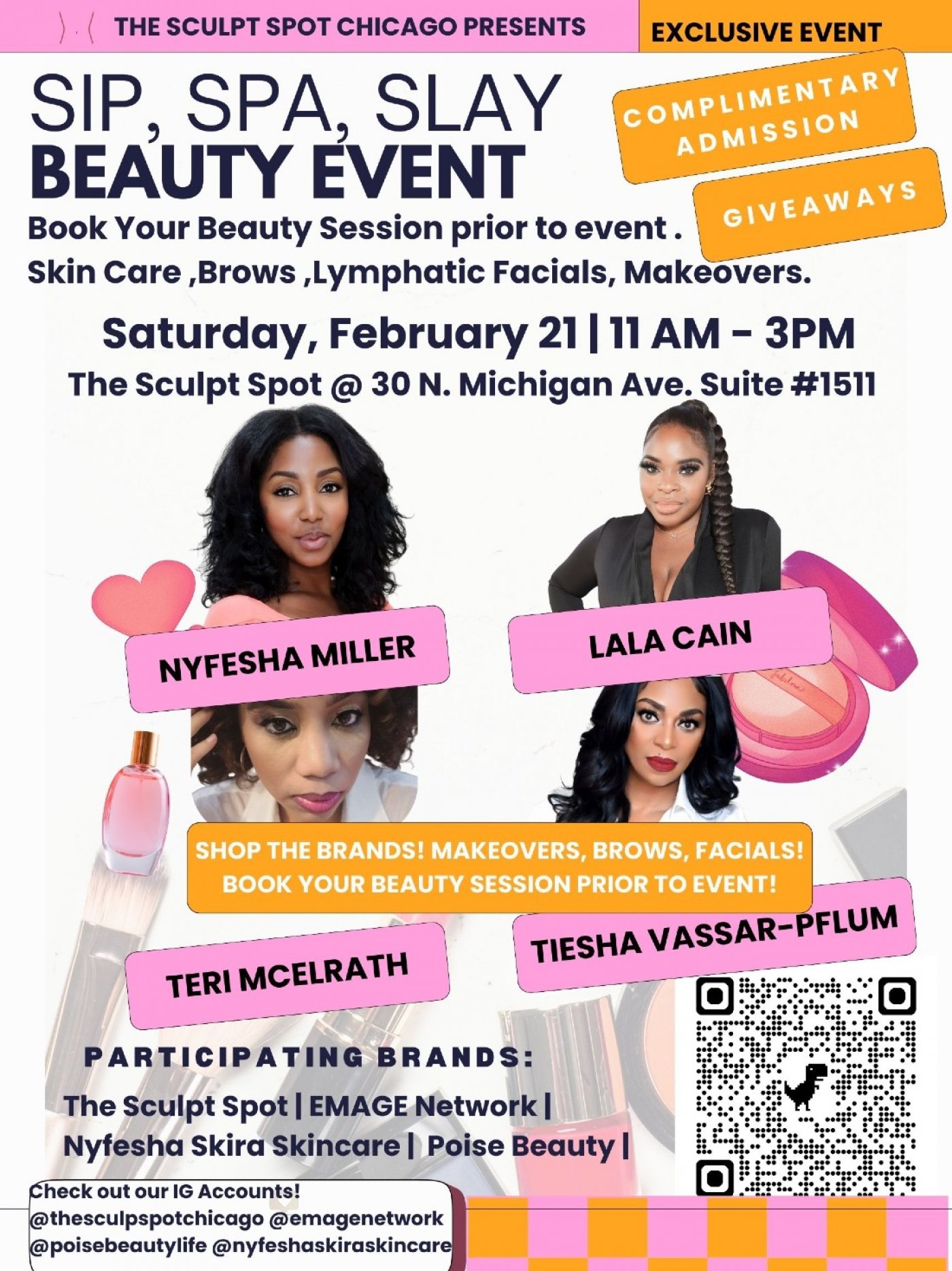 Join us for an exclusive spa-style beauty event at The Sculpt Spot Chicago. Relax, mingle, shop pop up shops, and enjoy express beauty services—including facials, skincare consultations, makeovers, and brow services—while sipping complimentary wine. Entry is free, so come soak in the elevated atmosphere and leave refreshed and glowing.