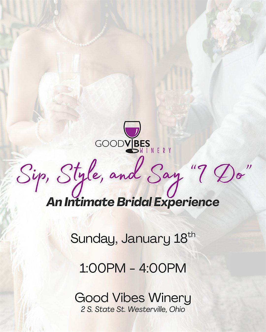Join us in person for a super chill day at Good Vibes Winery where you can sip on amazing wines, get inspired by bridal styles, and soak in all the lovely vibes! Whether you're planning your big day or just want to hang with some fabulous brides-to-be, this event is packed with fun and inspiration. Come ready to mingle, sip, and say "I do" to new ideas!