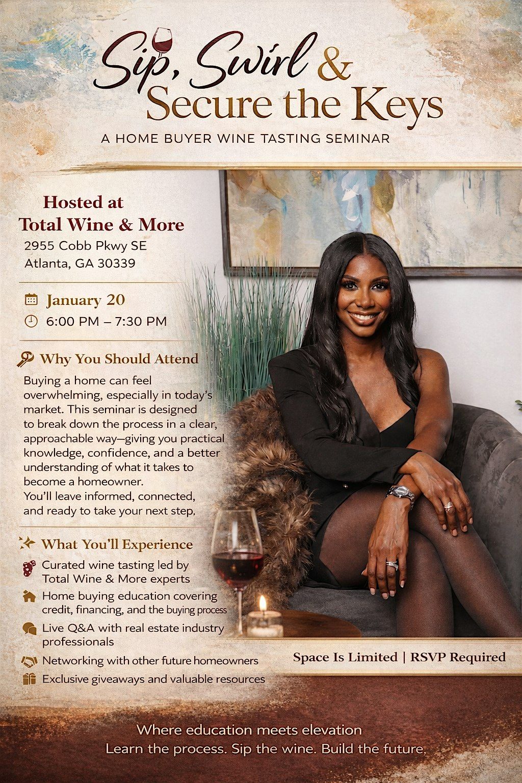 🍷 Sip, Swirl & Secure the Keys is an interactive home buyer wine tasting seminar hosted by licensed real estate agent and insurance broker Ronnise Clark Hall, designed to educate and empower future homeowners. Join us at Total Wine & More for an engaging evening featuring a curated wine tasting, practical home-buying insights, and live Q&A with industry professionals—all in a relaxed, upscale setting.
