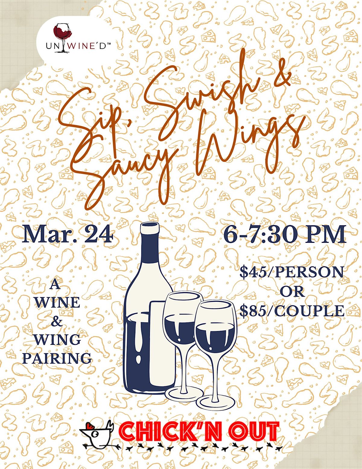 Come join us on Tuesday, March 24th, at 6:00 PM at UNWINE'D for a night filled with delicious chicken wings, unique wines, good vibes, and great company. Unwine'd and Chick ‘N Out have joined forces to bring you an unforgettable experience pairing mouth-watering wings with different wine varieties from around the world.