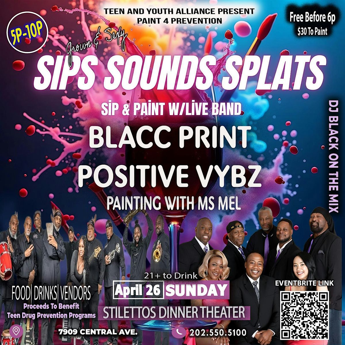 Welcome to Sips Sounds & Splats DMV! Join us for a fun-filled event at Stilettos Dinner Theater Hall Capital Heights Maryland, where you can sip on delicious drinks, groove to great music, and get creative with splatter painting. It's going to be a blast! Come hang out with us and enjoy a unique experience that combines art, music, and drinks. Don't miss out on this awesome event!
